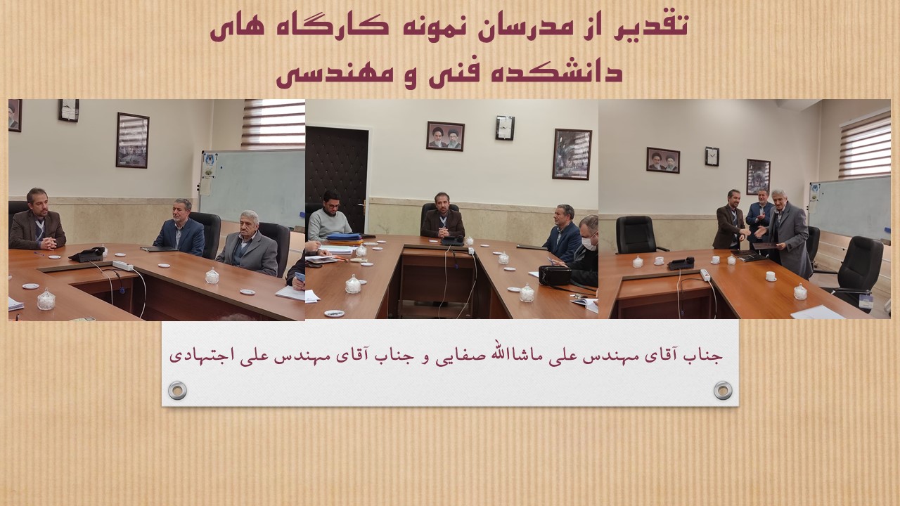 در تاریخ 5 دی 1401 در جلسه شورای دانشکده فنی و مهندسی که با حضور هیات رئیسه محترم دانشکده و مدیران محترم گروه ها برگزار گردید از دو نفر از مدرسان نمونه کارگاه های دانشکده تقدیر و تشکر به عمل آمد. در این مراسم جناب آقای دکترحمید رضا سنایی پور ریاست محترم دانشکده ضمن تشریح مجموع فعالیت های صورت گرفته در کارگاه ها و آزمایشگاه ها از جناب آقای مهندس علی ماشاالله صفایی و جناب آقای مهندس علی اجتهادی به عنوان مدرسان نمونه کارگاهی تقدیر و قدردانی نمودند.